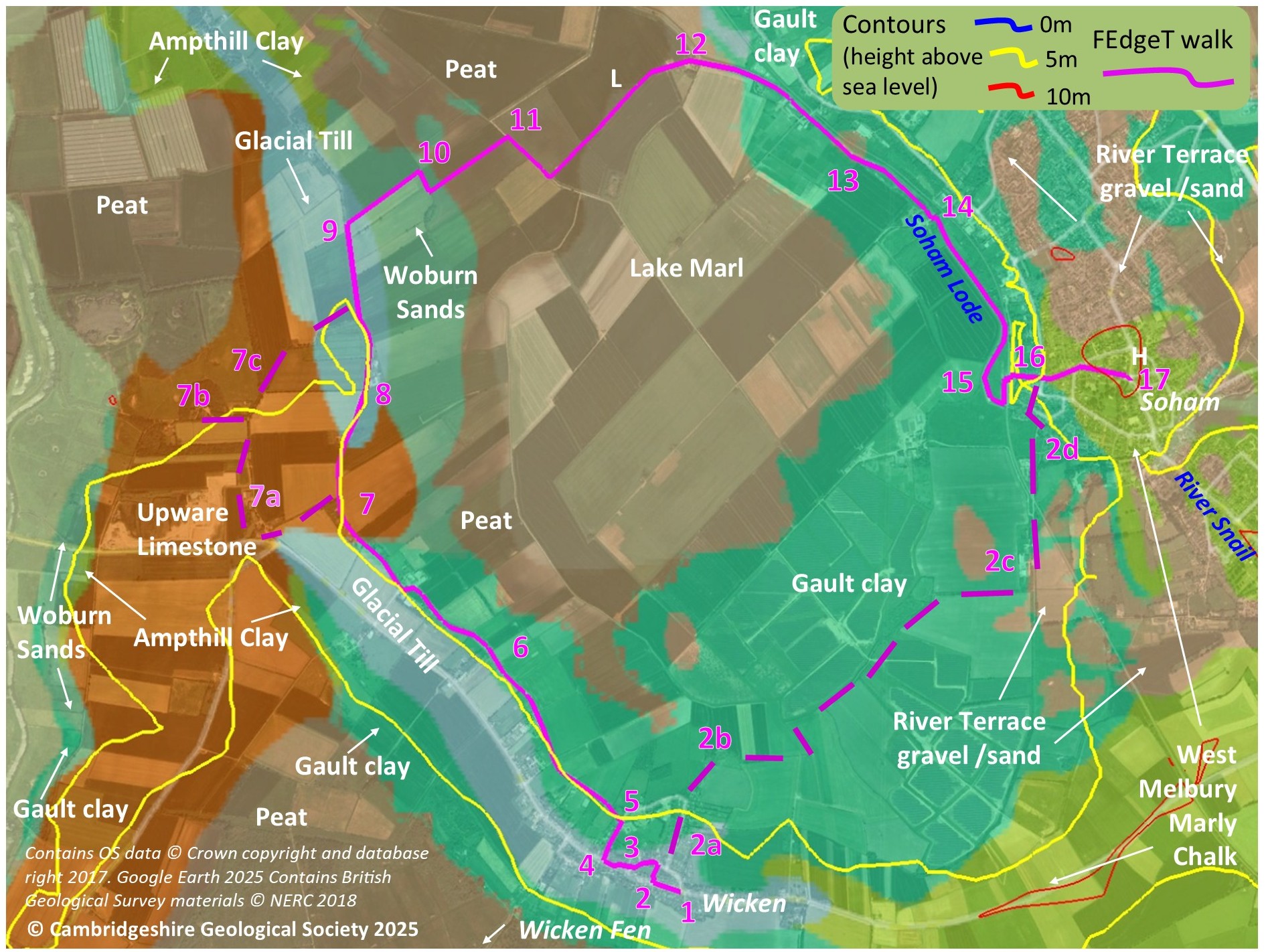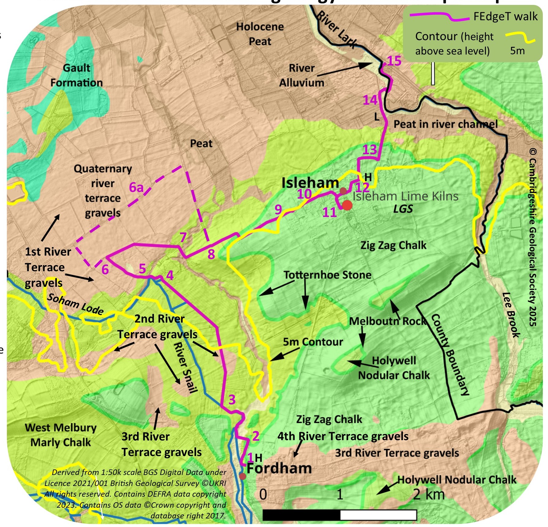 The walk crosses a small patch of river sands and gravels from the 2nd Terrace and then the large area of 1st Terrace to the north. These river terraces comprise a complex series of deposits, mostly sands and gravels, that have been left by strongly-flowing river channels, precursors of the current Cam-Ouse system. As the river cut down at various times, the deposits formed a gradually lower (and younger) set of (roughly defined) terraces as the topography changed. All four terraces occur in this area; the higher parts of eastern Fordham lie upon the sands and gravels of the 3rd and 4th Terraces. Due to reworking of the material, the ages of the various spreads of gravel are difficult to assess but radiocarbon dating of fossils and other organic material has produced dates, covering both cold and warmer periods, from c.300,000 years ago to the end of the last glaciation c.20-12,000 years ago. In the marshy conditions of the last several thousand years (the Holocene), Peat formed over much of the (relatively impermeable) marly Chalk and the gravels, but now remains only in small patches; this includes some thin ribbons along the previous courses of water channels, which carved incised “valleys” into the Chalk, shown by the southward detours of the 5m contour.