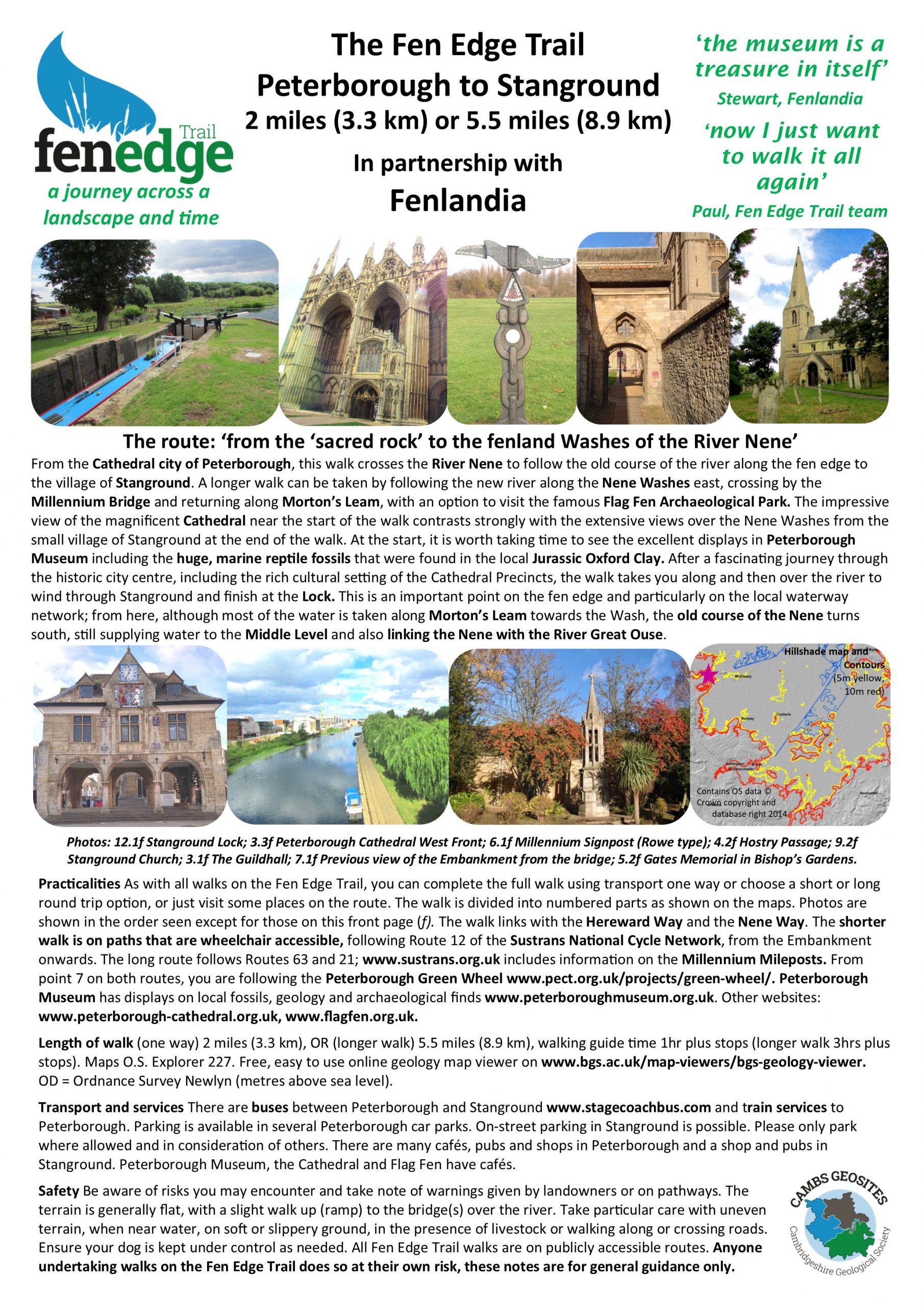 From the Cathedral city of Peterborough, this walk crosses the River Nene to follow the old course of the river along the fen edge to the village of Stanground. A longer walk can be taken by following the new river along the Nene Washes east, crossing by the Millennium Bridge and returning along Morton’s Leam, with an option to visit the famous Flag Fen Archaeological Park. The impressive view of the magnificent Cathedral near the start of the walk contrasts strongly with the extensive views over the Nene Washes from the small village of Stanground at the end of the walk. At the start, it is worth taking time to see the excellent displays in Peterborough Museum including the huge, marine reptile fossils that were found in the local Jurassic Oxford Clay.